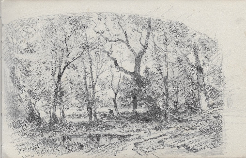C74 Dessin au crayon (feuille 130*210 mm) par Émile Benoit Noirot (Roanne (Loire), 5 juin 1853 † St-Germain-des-Fossés (Allier), 5 juin 1924), Signé, situé et daté en bg. 18ème dessin du carnet B : paysage animé où aucun élément ne permet d’identifier le lieu excepté l’indication de l’artiste et qui reprend un thème cher à ce dernier. Dans un bois, au premier plan, une mare à gauche bordée par un chemin à droite, derrière une gardeuse de chèvre assise. La mise en page fait penser à celle d’un projet de lithographie. Dessin extrait du carnet C/ (n°57-90). En savoir plus.