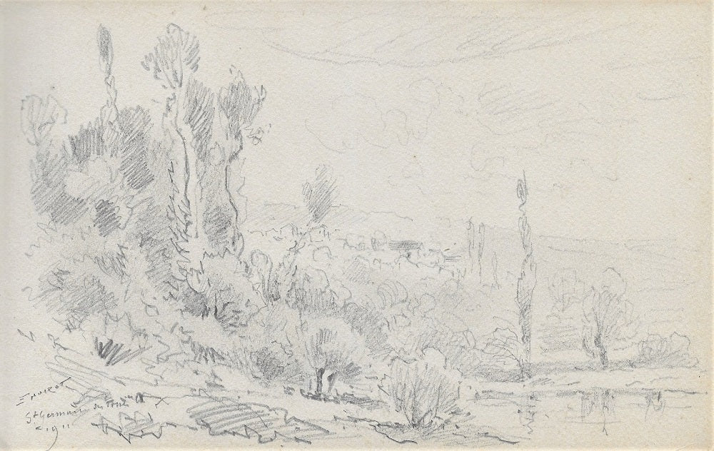 C75 Dessin au crayon (feuille 130*210 mm) par Émile Benoit Noirot (Roanne (Loire), 5 juin 1853 † St-Germain-des-Fossés (Allier), 5 juin 1924), Signé, situé et daté en bg. 19ème dessin du carnet C (feuille 130*210 mm), Signé, situé et daté en bg E. NOIROT | St Germain des Fossés | 1911. Comme pour le dessin précédent, rien ne permet de situer ce paysage de l'Allier qui reprends un thème classique, des arbres, peupliers et autres feuillus, de l’eau, dans le fond, au centre du contrefort d’une colline, les silhouettes de maisons.