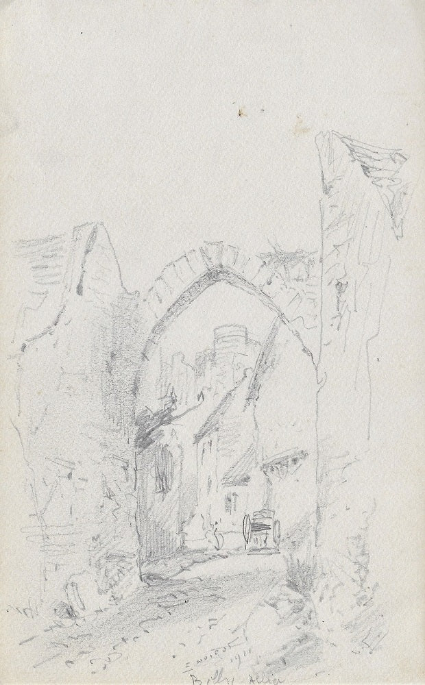 C76 Dessin au crayon par Émile Benoit Noirot (Roanne (Loire), 5 juin 1853 † St-Germain-des-Fossés (Allier), 5 juin 1924), 20ème dessin du carnet C (feuille 130*210 mm), Signé, situé et daté en bas au centre E. NOIROT | 1911 | Billy | Allier. Au premier plan, vue, au travers d’un arc brisé, reste de l’ancienne porte du village ou porte Chabotin, avec dans le fond une charrette contre de vieilles bâtisses dont une avec corbeaux, dominés par les ruines du château.