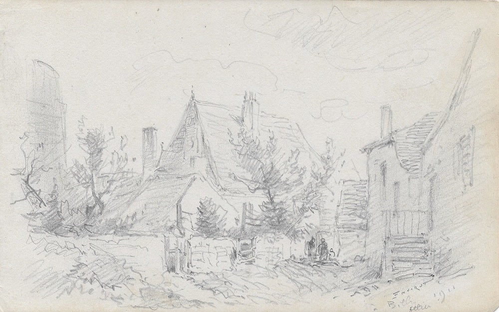 C77 Dessin, crayon (feuille 130*210 mm) par Émile Benoit Noirot (Roanne (Loire), 5 juin 1853 † St-Germain-des-Fossés (Allier), 5 juin 1924) 21ème dessin du carnet C (feuille 130*210 mm), Signé, situé et daté en bd E. NOIROT | à Billy | Allier | 1911. Paysage animé. Trois silhouettes en discussion au fond d’une rue bordée, à gauche par une maison avec escalier et à droite les murets de jardins au pied des remparts du château médièval que l’on devine à l’extrême gauche, mettent en évidence la toiture de la demeure placée au centre de la composition derrière trois feuillus.