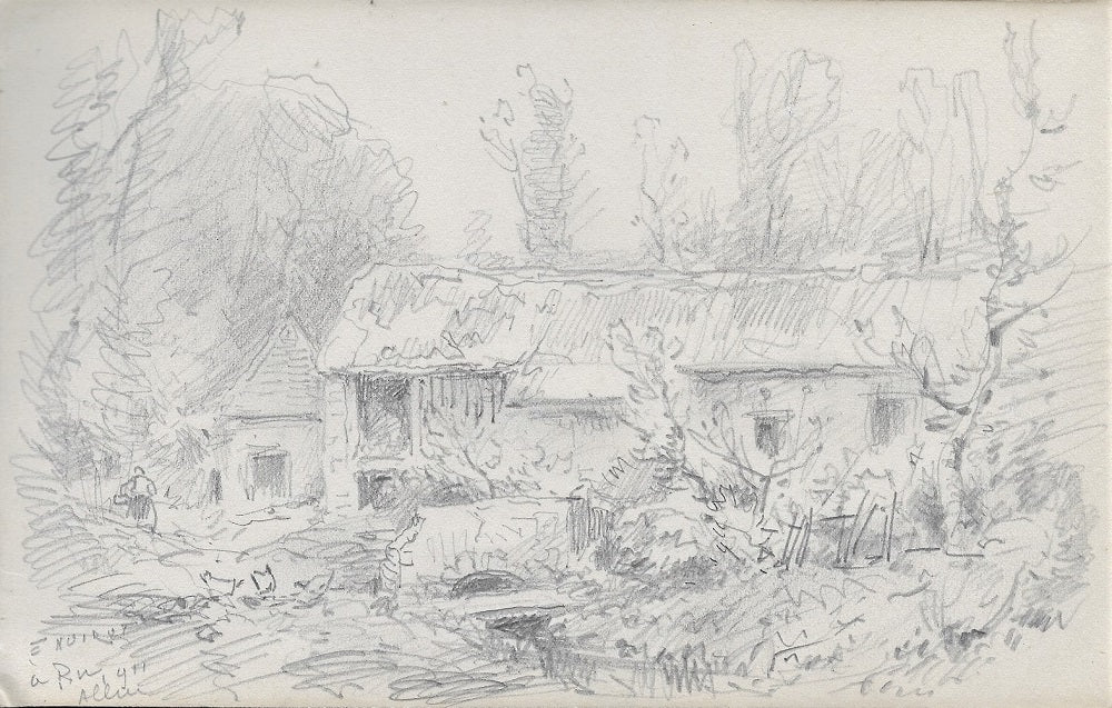 C80 Dessin, crayon (feuille 130*210 mm) par Émile Benoit Noirot (Roanne (Loire), 5 juin 1853 † St-Germain-des-Fossés (Allier), 5 juin 1924) 24ème dessin du carnet C ((feuille 130*210 mm), Signé, situé et daté en bg E. NOIROT | à Ru | 1911 | Allier : paysage animé à Rhue, entre Vichy et Le Bourzat (Saint-Germain-des-Fossés), représentant une vielle ferme avec paysanne portant un panier et volailles. Au premier plan, un ru (d’où peut-être la confusion de l’artiste qui nouveau-venu ne maitrisait pas les écarts locaux) avec une passerelle en bois et un ouvrage travaillé en pierre. En arrière-plan un corps de ferme composé de deux bâtiments sur un fond de feuillus.