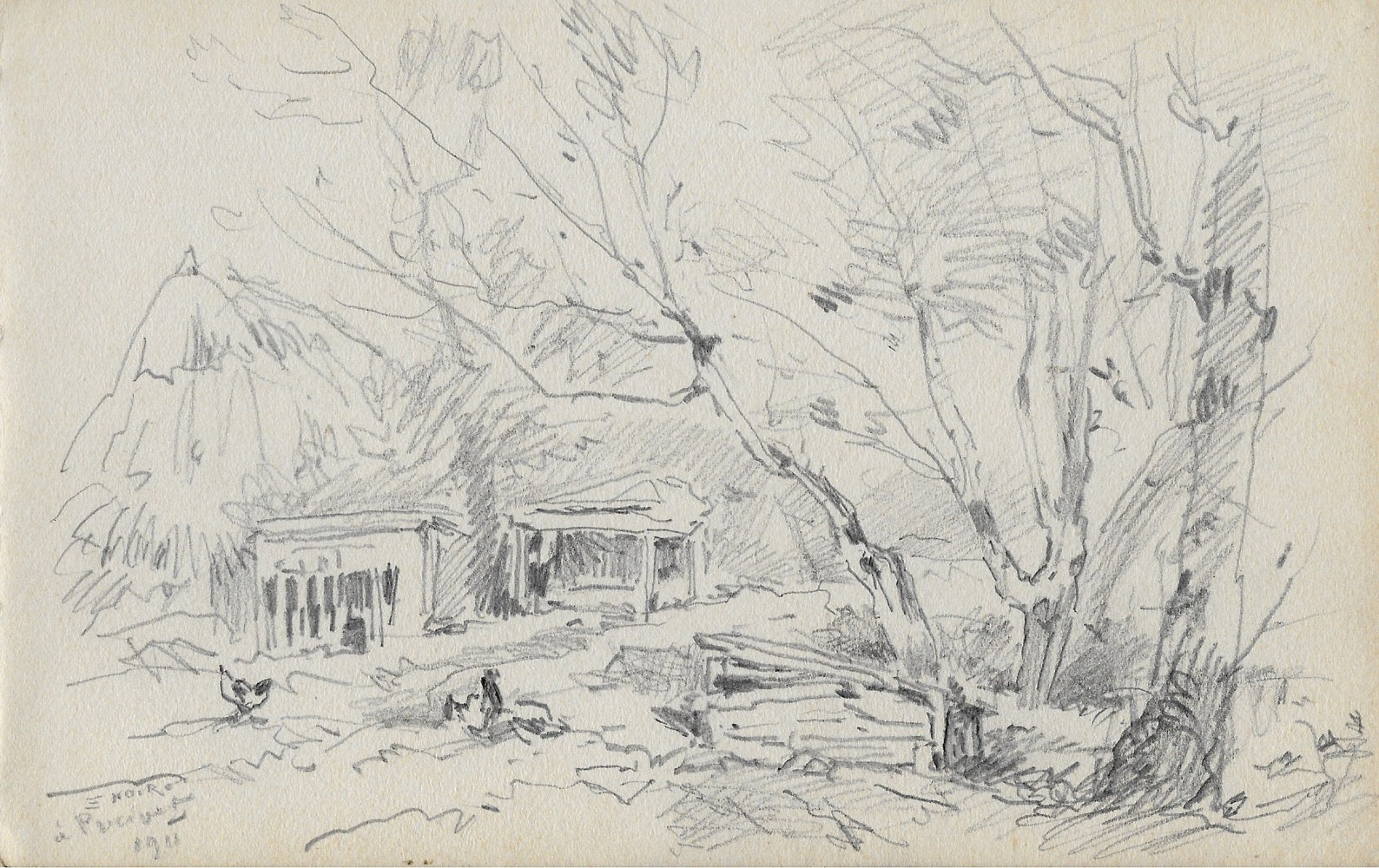 C83 Dessin, crayon (feuille 130*210 mm) par Émile Benoit Noirot (Roanne (Loire), 5 juin 1853 † St-Germain-des-Fossés (Allier), 5 juin 1924) Signé, situé (illisible) et daté en bg E. NOIROT | à P***** | 1911. Même lieu non identifié que le dessin précédent. 27ème dessin du carnet C (feuille 130*210 mm). Titre forgé. Au premier plan à gauche deux poules sur un chemin, à droite un trou d’où émergent un cabanon en bois entouré de quatre feuillus (le dernier esquissé). Derrière les poules, deux autres cabanons séparés par un arbre, derrière un édifice !