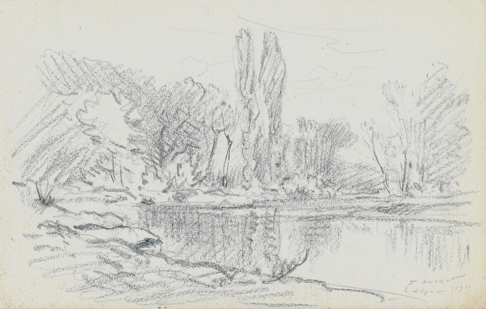 C85 Dessin, crayon vert par Émile Benoit Noirot (Roanne (Loire), 5 juin 1853 † St-Germain-des-Fossés (Allier), 5 juin 1924) Signé, situé et daté en bd E. NOIROT | le Lignon 1911. 29ème dessin du carnet C (feuille 130*210 mm), Paysage. Au premier plan, rive de la rivière Le Lignon qui tourne à droite d’un bosquet où l’on aperçoit la façade d’une maison (moulin ?). Le dessin précédent nous incite à penser qu’il s’agit du Lignon qui prend sa source dans les monts du Forez au col de la Chamboite sur Chalmazel, et, après cinquante-neuf kilomètres se jette dans la Loire près de Feurs.