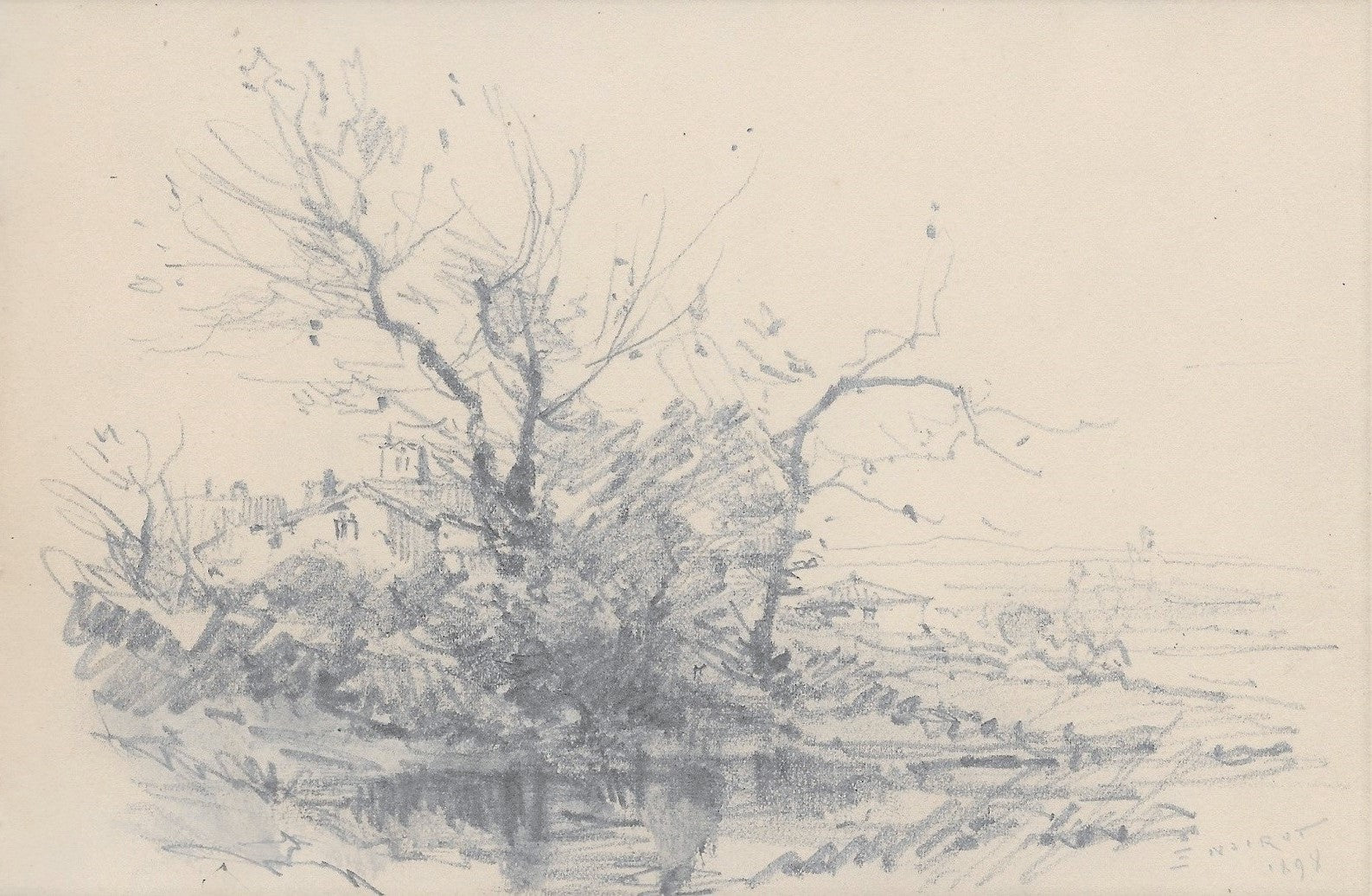 D97 Crayon par Émile Noirot (Roanne (Loire), 5 juin 1853 † St-Germain-des-Fossés (Allier), 5 juin 1924), 7ème dessin du carnet D (feuille 117*183 mm), Signé et daté en bd NOIROT | 1898. Au premier-plan, une mare devant des taillis et quelques arbustes derrière lesquels on aperçoit à gauche un village (Villerest ?) et le clocher carré de son église, à droite une maison. En arrière-plan, des reliefs.
