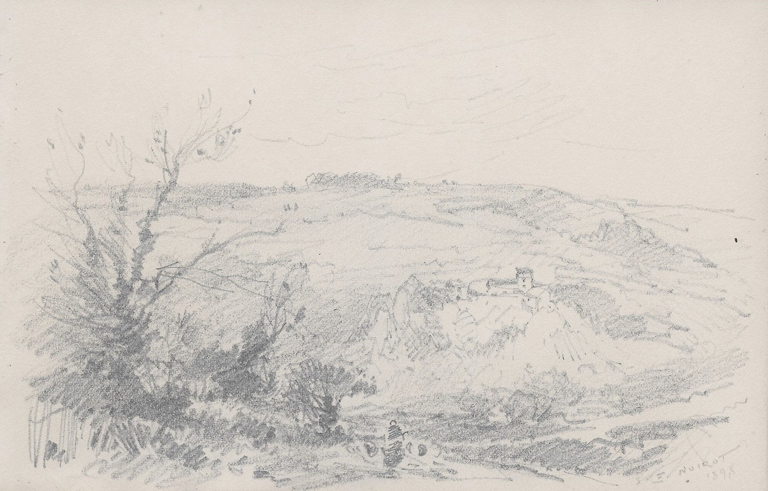 D 99 Crayon par Émile Noirot (Roanne (Loire), 5 juin 1853 † St-Germain-des-Fossés (Allier), 5 juin 1924), 9ème dessin du carnet D (feuille 117*183 mm), Signé, daté en bg E. NOIROT | 1898. Titre forgé. Autre paysage roannais ? À gauche, au premier plan, des arbustes et taillis avec une paysanne (près du dernier arbuste à droite) surplombent une vallée au milieu de laquelle un promontoire rocheux où se dresse une ferme avec un pigeonnier ; en arrière-plan, le versant opposé avec des arbres sur la crête descendant vers la droite.