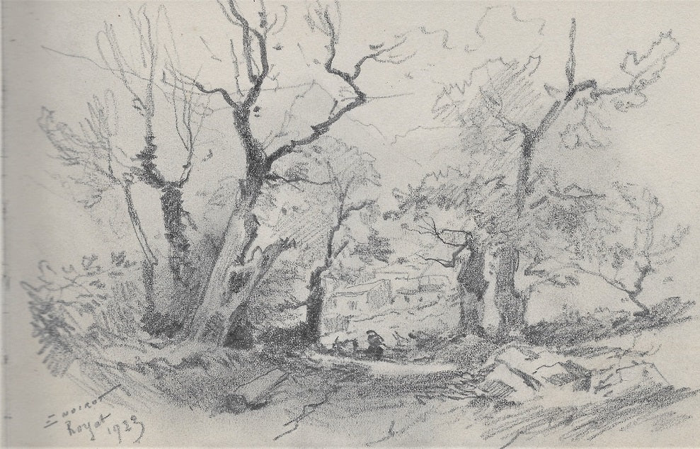 B22 Dessin au crayon (feuille 130*204 mm) par Émile Benoit Noirot (Roanne (Loire), 5 juin 1853 † St-Germain-des-Fossés (Allier), 5 juin 1924), Signé, situé et daté en bg. Paysage animée au milieu d’un chemin bordé d’arbres une gardeuse de chèvres et ses bêtes, en arrière-plan en contrebas des bâtiments. … Dessin extrait du carnet B/ (n°19-56).