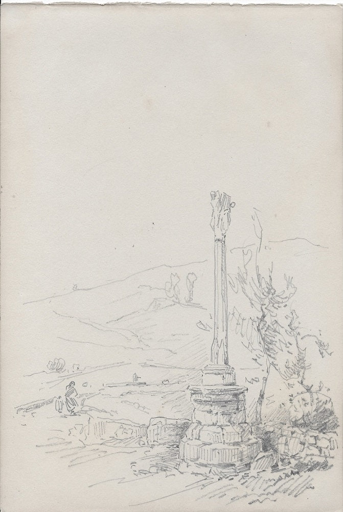 A10 Esquisse, Crayon (feuille 175*259 mm) par Émile Benoit Noirot (Roanne (Loire), 5 juin 1853 † St-Germain-des-Fossés (Allier), 5 juin 1924), NS. Paysage rural animé. Non situé, 10ème dessin du carnet A ; belle vue de cet élément artistique religieux probablement en Haute-Loire où Noirot est venu à la demande de son ami Félix Thiollier afin d’illustrer un ouvrage de ce dernier sur les églises romanes du Velay. Dessin extrait du carnet A/ (n°01-18). En savoir plus.