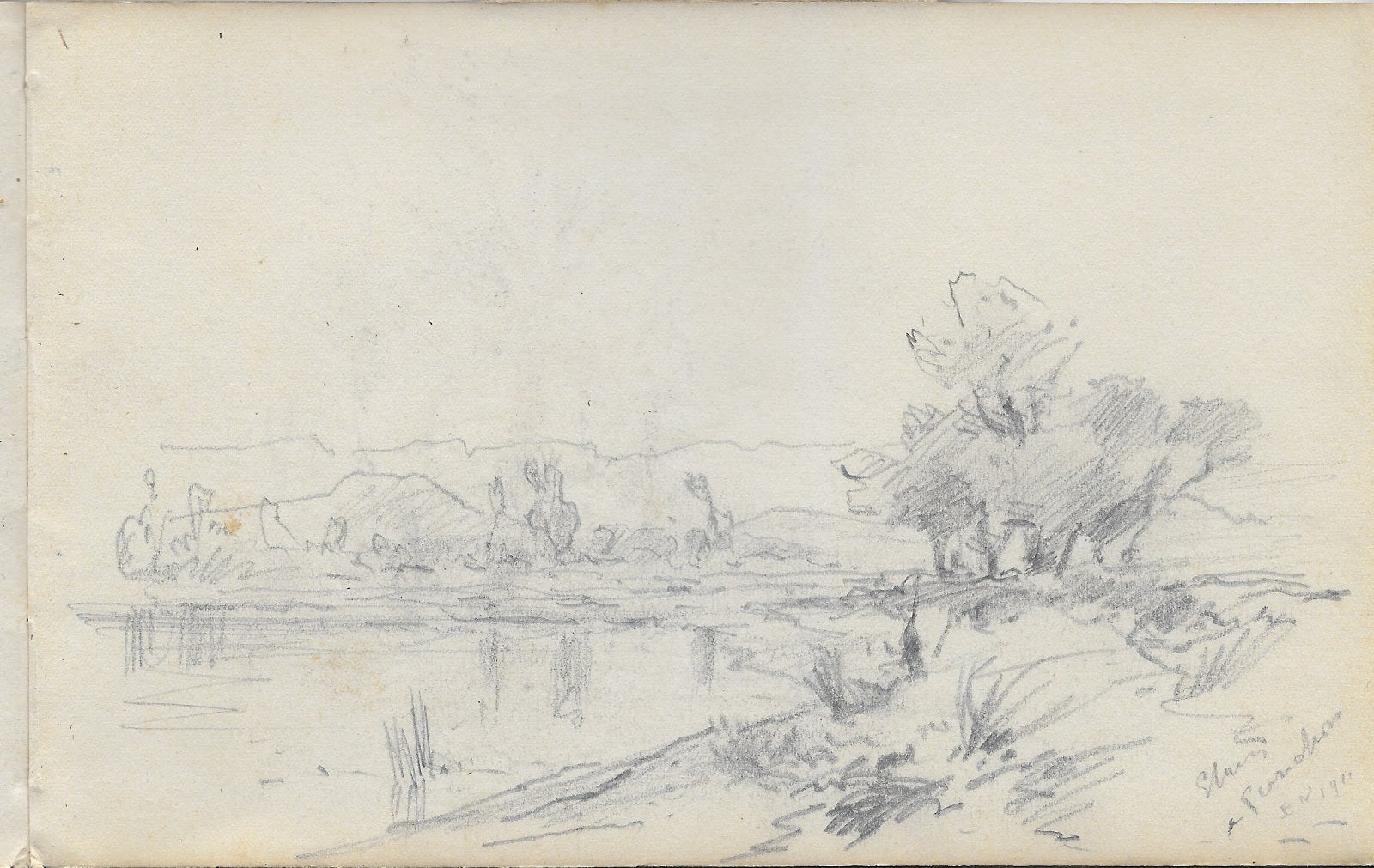 C89 Crayon par Émile Noirot (Roanne (Loire), 5 juin 1853 † St-Germain-des-Fossés (Allier), 5 juin 1924), Situé, monogrammé et daté en bd Étang | à Perrichon | EN | 1911. 33ème dessin du carnet C (feuille 130*210 mm). Paysage de la Loire entre Feurs et Saint-Etienne.