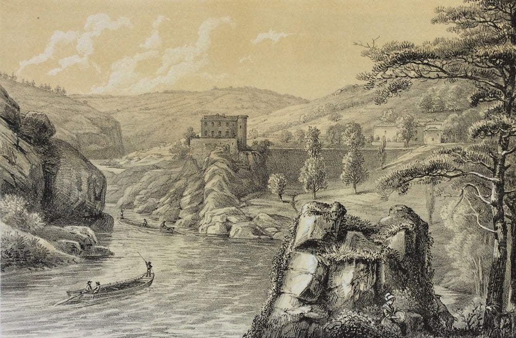 Lithographie originale deux couleurs par Jean-Louis Noirot (Neufbrisach (Haut-Rhin), 1820 † Villerest (Loire), 1902). Roanne et ses environs. Paysage rural animé, cours d'eau, barque, transport fluvial,, bâtiment, monument. La planche environ 250*335 mm. Marges