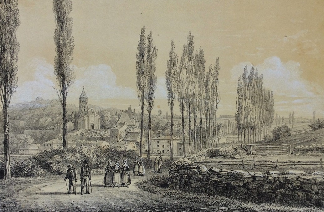 Lithographie originale deux couleurs par Jean-Louis Noirot (Neufbrisach (Haut-Rhin), 1820 † Villerest (Loire), 1902). Roanne et ses environs. Paysage rural animé (village, église, personnages, hommes, femmes, costumes) La planche environ 250*335 mm. Marges