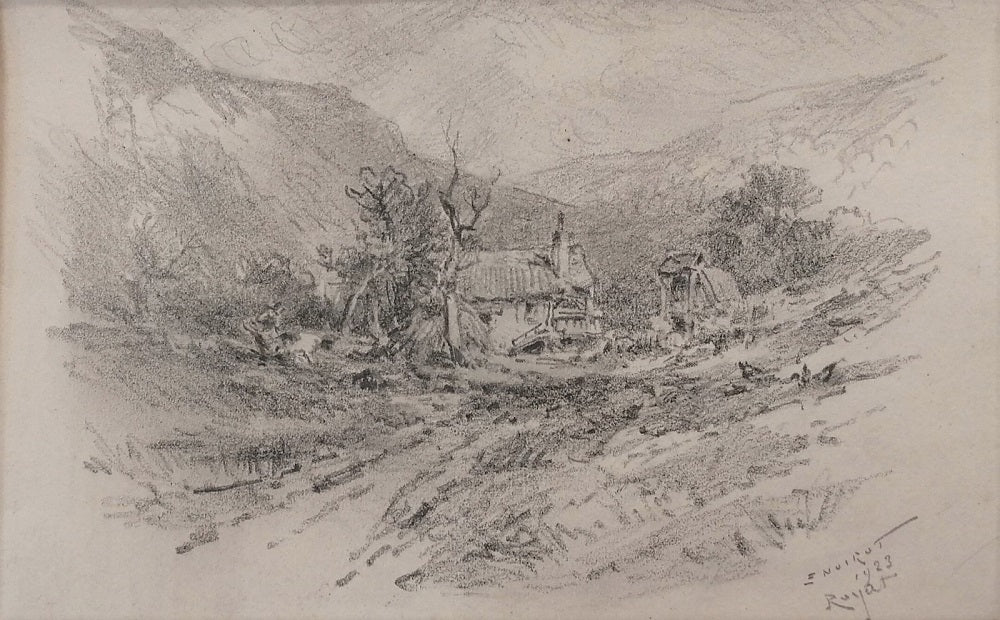 X126 Dessin au crayon par Émile Benoit Noirot (Roanne (Loire), 5 juin 1853 † St-Germain-des-Fossés (Allier), 5 juin 1924), Signé, situé et daté en bg. 132*208 mm, sous passe-partout 200*270 mm, adhésif bordure supérieure, extrait d’un carnet (bord détaché à gauche). Dos insolé (marqué par une attache antérieure du cadre). Paysage d’Auvergne, dans un vallon au bout d’un chemin quelques arbres et une ferme… .