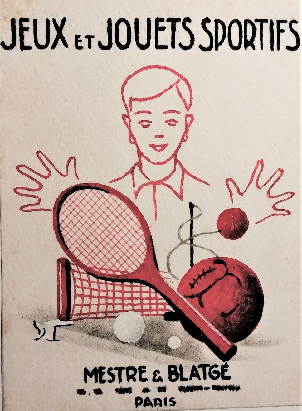 Dessin préparatoire par André Noyer (début 20e) pour une publicité d’un magasin de jouets parisien représentant un jeune homme derrière un filet de table de ping-pong avec une raquette de tennis, un ballon, un ballon de foot et une balle de Jokari. ns. 100*75 mm.