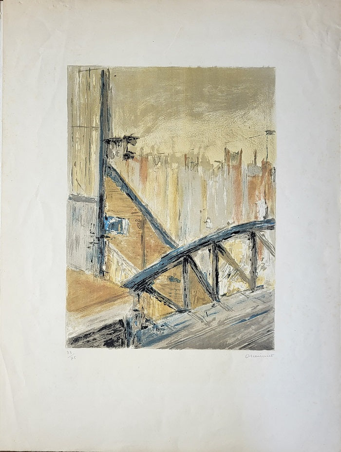 Estampe/Lithographie par Jack Ottaviano (Vichy, 20 juin 1924 † Clermont-Ferrand, 1er juin 1988), au crayon numérotée 33/75 en bg, Sbd, dim. : 65*49mm. Froissements dans les marges. Après avoir représenté les effets de la guerre sur les villes détruites, Jack Ottaviano montre la reconstruction, avec l'importante série des chantiers navals, puis le résultat de certains excès de cette reconstruction, les paysages urbains de « tours » et de « barres » dont la masse apparaît écraser l'homme. La lithographie sera reprise pour illustrer l'affiche de l'exposition à la galerie parisienne Carlier (22 avril - 2 mai 1964) précédant deux expositions à Washington puis à New York.