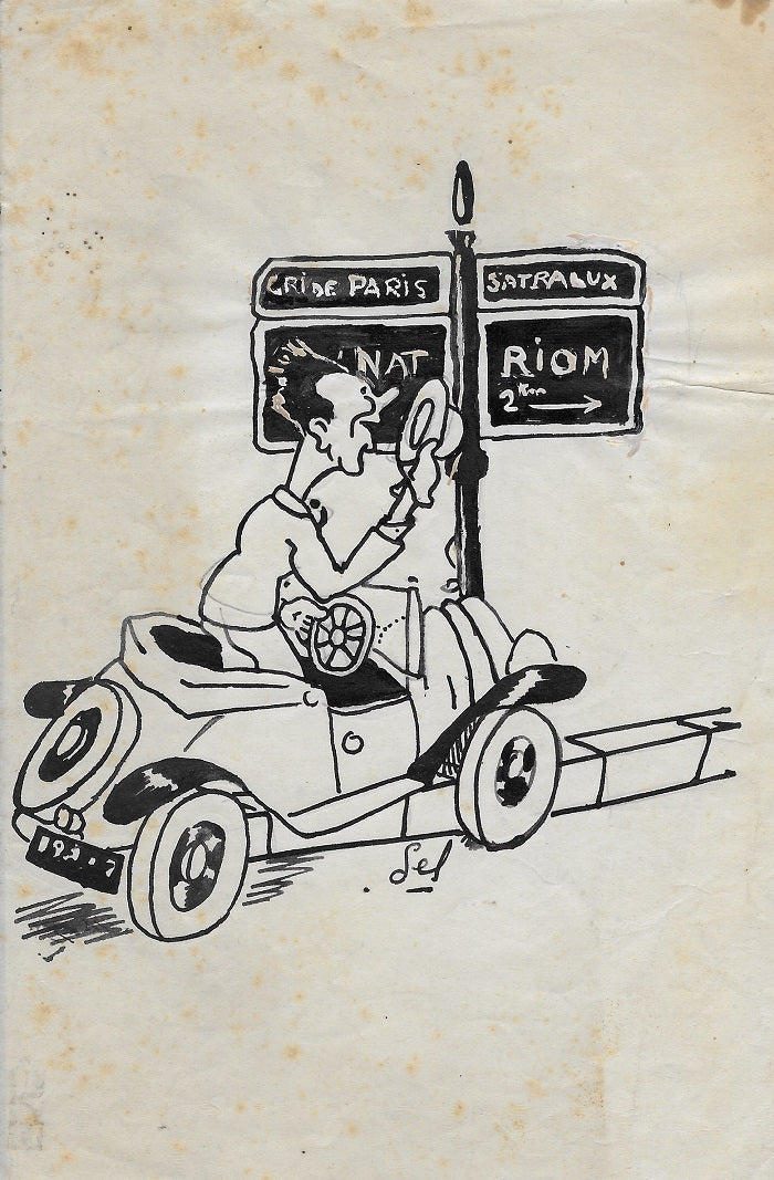 Dessin à l'encre de Jean Perissel (Vichy, 6 mars 1917 † Cannes, 28 juillet 1989), en bas au centre signature " Sel " à gauche du pneu av. 208*134mm. Épidermures, froissements.