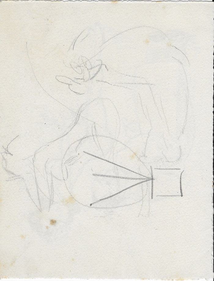 Dessin à l'encre et crayon du carabin Jean Perissel (Vichy, 6 mars 1917 † Cannes, 28 juillet 1989) sur papier Vidalon d'Annonay (filigrane à gauche, parallèle à la jeune femme), NS. 162*125 mm. Au verso, esquisse d'un dessin plus "osé".