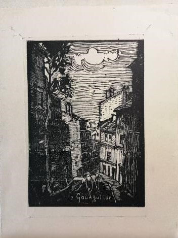Estampe/Bois par Fernand THUAIRE (Ivry-sur-Seine, 26 février 1875 † 1941). Monogrammé en bg ft et titrée le Gourguillon au centre. Paysage urbain animé : deux personnages déambulent dans le Gourguillon, quartier de charme de la capitale des Gaules, Lyon. La feuille 166*122 mm, au TC 114*80 mm. Accroc en bd du sujet sans nuisance à la lecture. Venant de la Nièvre, THUAIRE arrive à Lyon en 1920 pour enseigner à l’école primaire supérieure, rue Chaponnay.