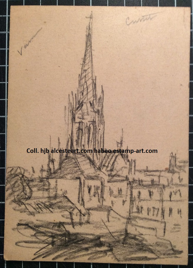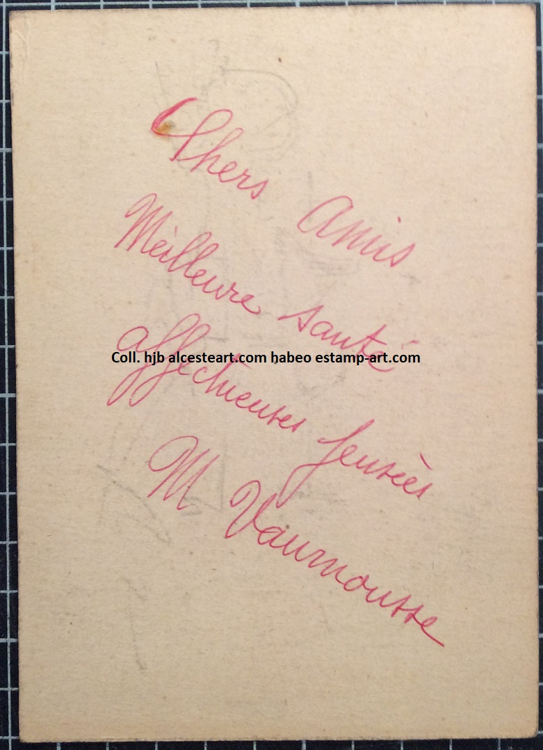 Dessin au crayon sur carton fort par Maurice Vaumousse (Paris, 30 octobre 1876 † 25 novembre 1961), au crayon shg et situé en hd, annoté au verso au stylo à l’encre rouge Chers Amis | Meilleure santé | affectueuses pensées | M Vaumousse ; 148*106 mm. Sous passe partout 30*24 cm.